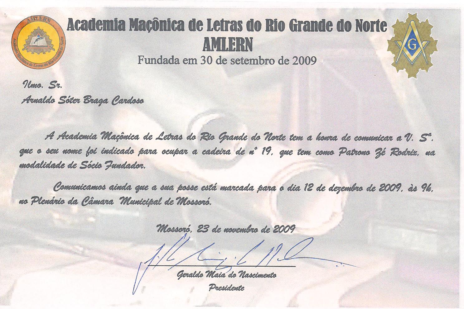 Convite da Academia Maçônica de Letras do Rio Grande do Norte